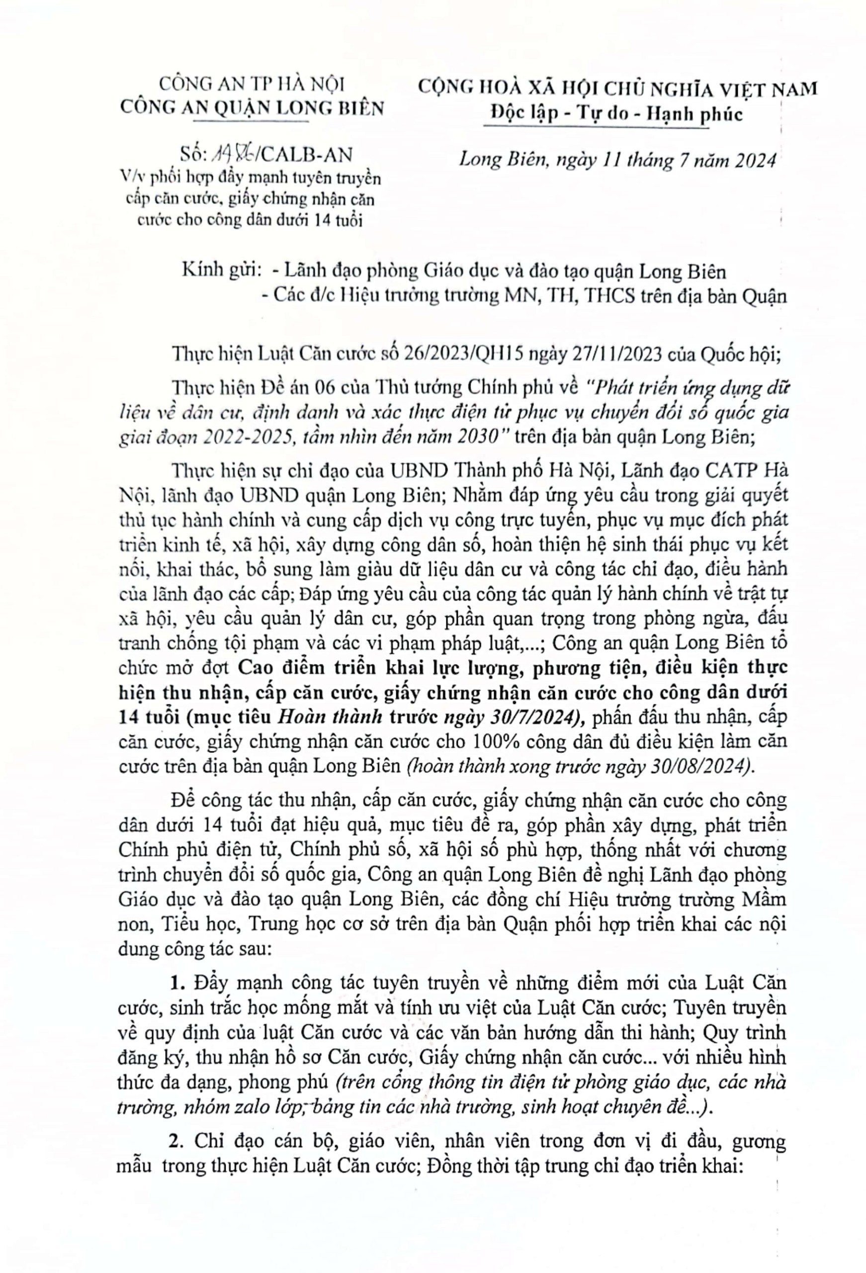 Công văn số 1486/CALB-AN ngày 11/7/2024 của Công an quận Long Biên v/v Phối hợp đẩy mạnh tuyên truyền cấp căn cước, giấy chứng nhận căn cước cho công dân dưới 14 tuổi